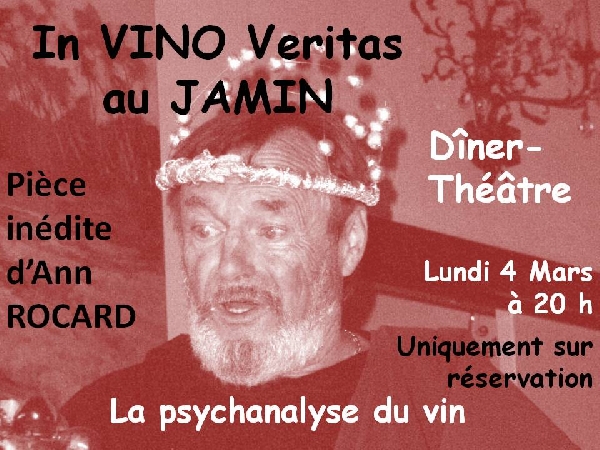 Entre magie et enchantement, dans le cadre épuré de JAMIN, symbole de la Gastronomie, In VINO Veritas, pièce inédite, psychanalytiquement improbable, historiquement documentée, née sous la plume d'Ann ROCARD spécialement pour notre compagnie, vous révèlera l'histoire du vin de la petite enfance à l'âge mûr.